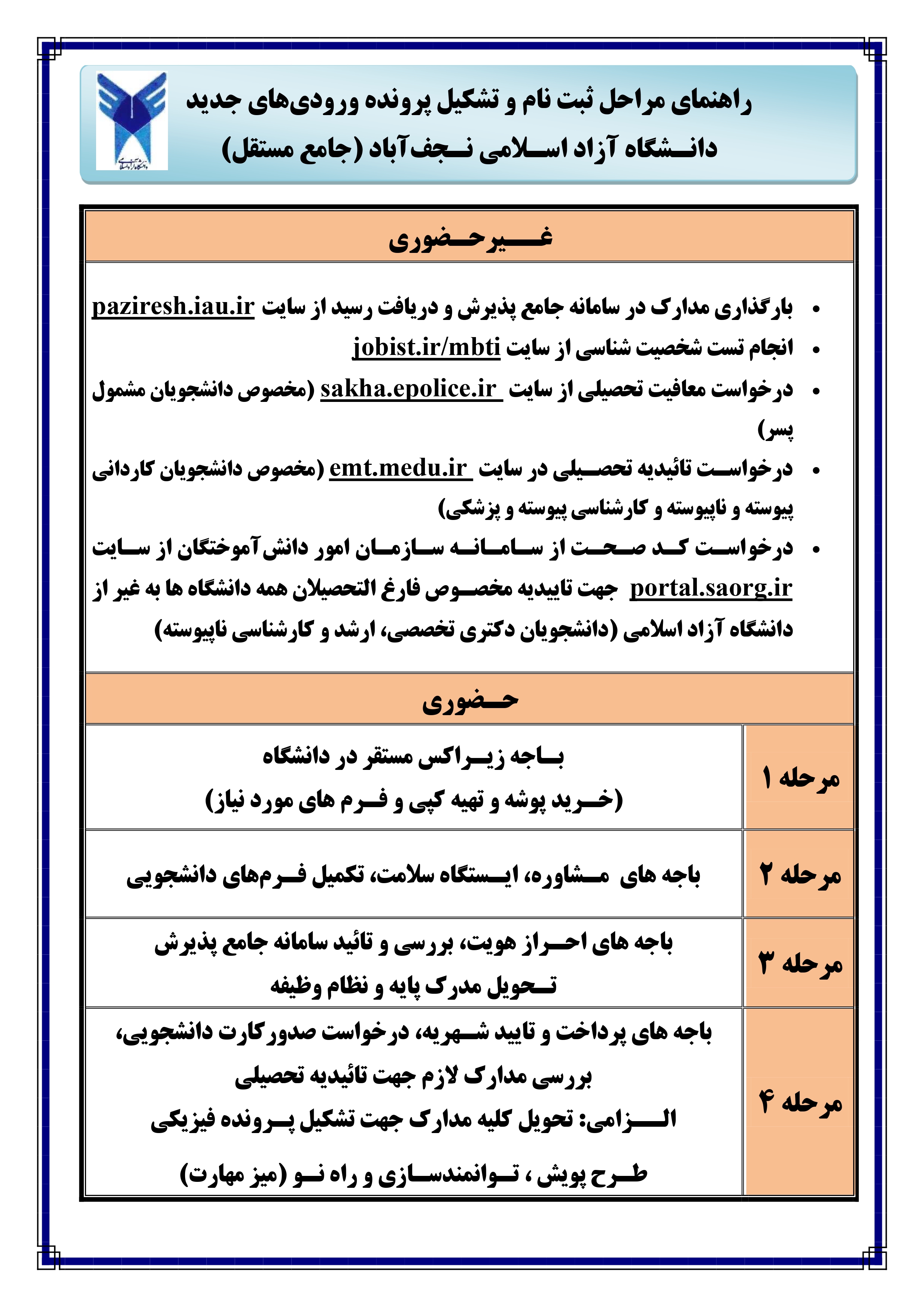 پذیرفته شدگان جدید الورود باید جهت اطلاع از شماره دانشجویی خود به سایت azmoon.iau.ir مراجعه و پس از آن به سامانه جامع پذیرش به آدرس paziresh.iau.ir رفته و نسبت به تکمیل مدارک و احراز هویت آنلاین اقدام نمایند.